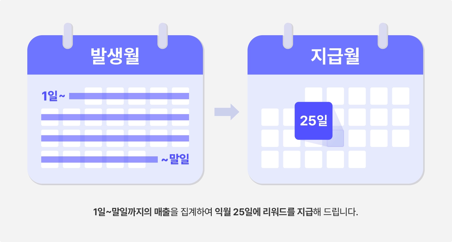 1일~말일까지의 매출을 지급률(%)에 따라 집계하여 익월 25일에 리워드를 지급해 드립니다.